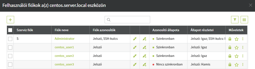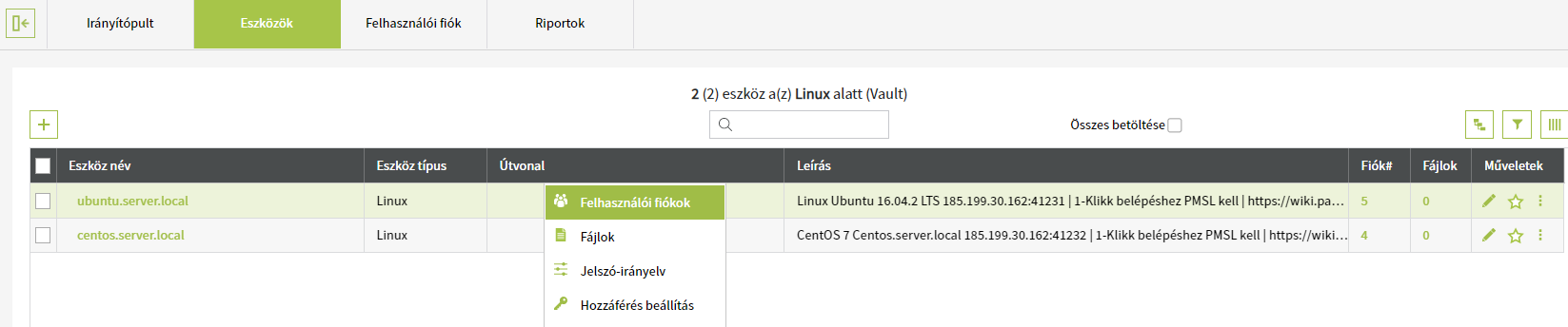Felhasználói fiókot egy már meglévő eszközhöz tudunk hozzáadni. Az Eszközök fülön kattintsunk adott sorra jobb klikkel, majd válasszuk ezt: Felhasználói fiókok.