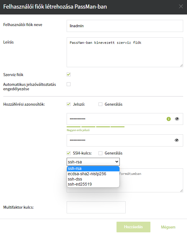 Itt egy újabb felugró ablak fogad minket, ahol megadhatjuk a Felhasználói fiók nevét, fiók leírását és jelszavát (valamint SSH-kulcsát 'Unix' alapú eszközöknél: Cisco, Linux, Mac, Solaris).