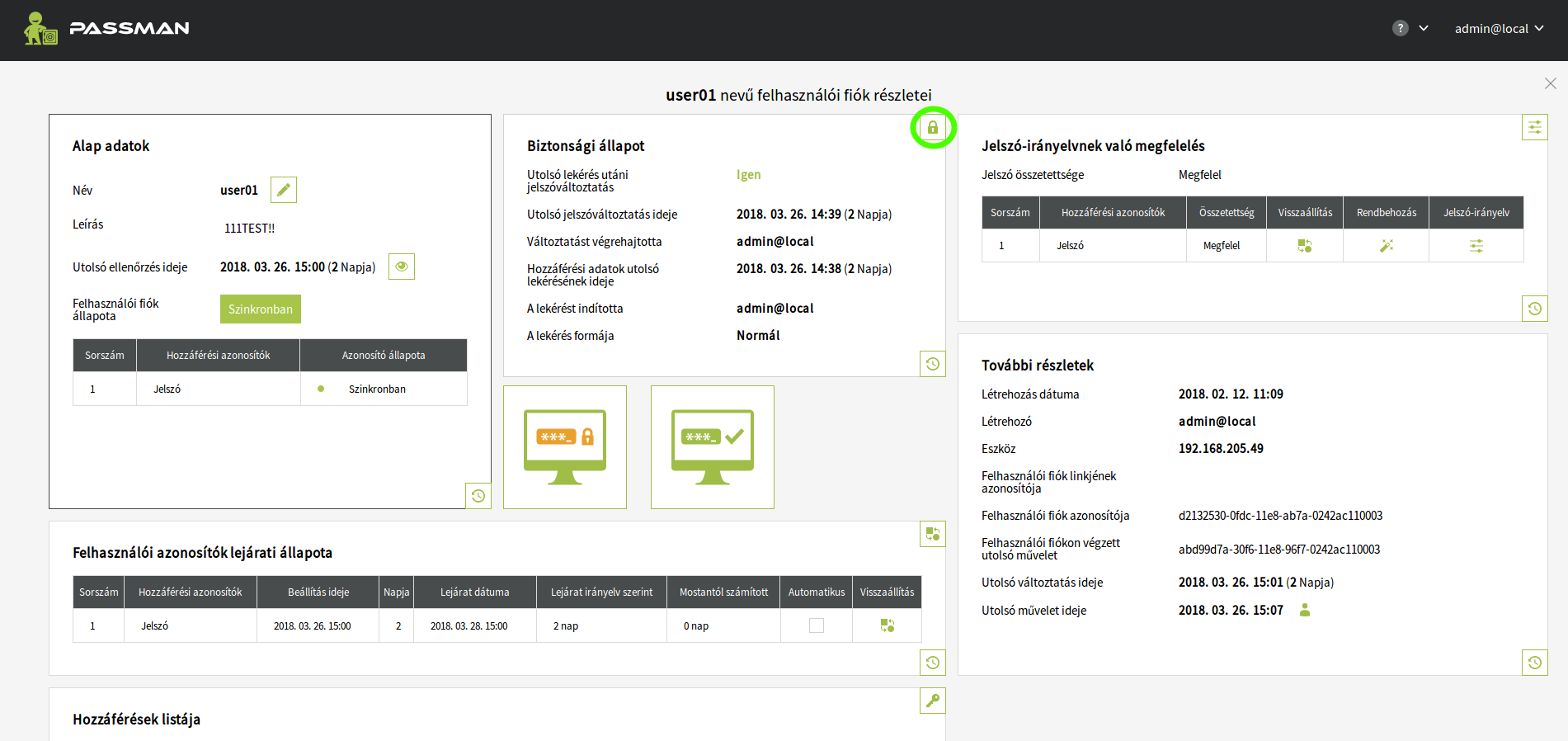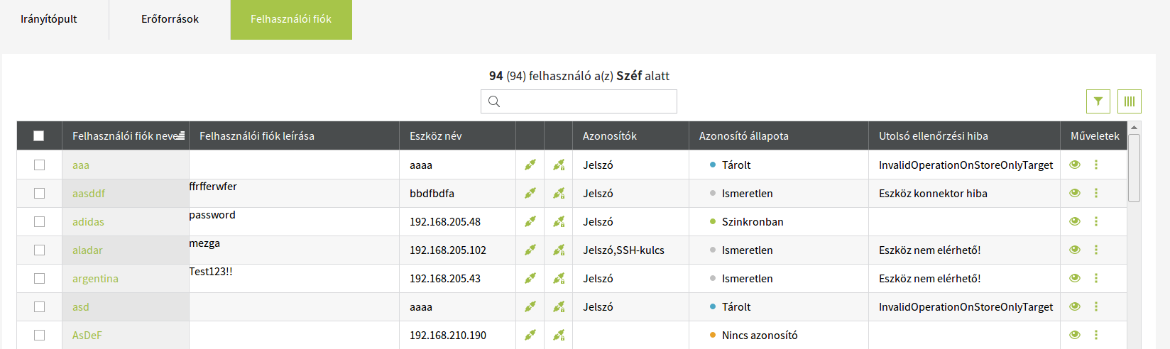 - a Műveletek oszlopban a Lakat ikonra kattintva megnézhetjük a felhasználói fiókhoz tartozó jelszót, SSH kulcsot vagy PIN kódot.