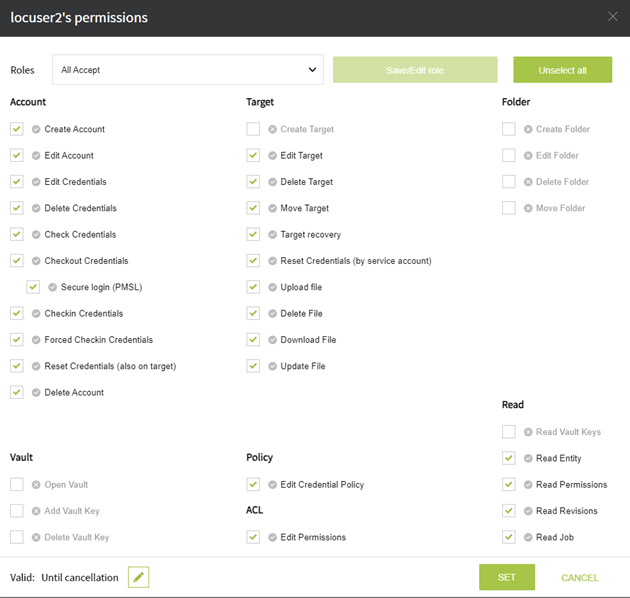 If you want to set the rights of a user or group for a specific time, click on the icon in the lower left corner, next to Valid: Until cancellation text.
