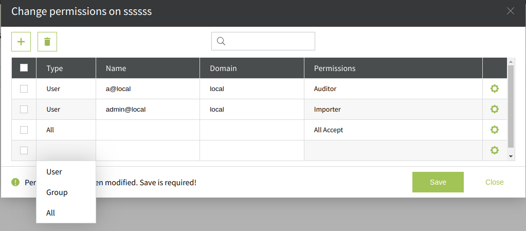 To add a permission simply click on the icon in the upper left corner of the window. To delete one, first check the check-box in front of it, than click on the icon.