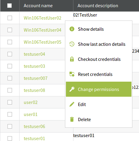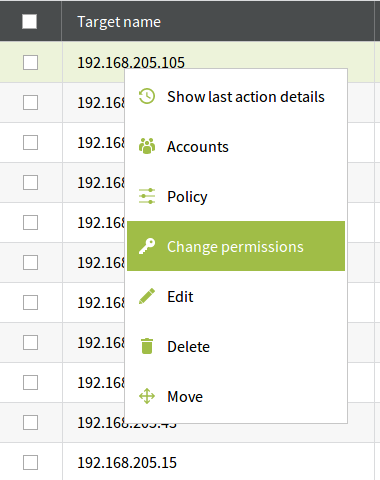 Permission settings are very complex. It is possible to set a permission list for a group, a Target or an Account. To access the permissions settings just trigger the context menu for the object you want to set it for and select Change permissions option.