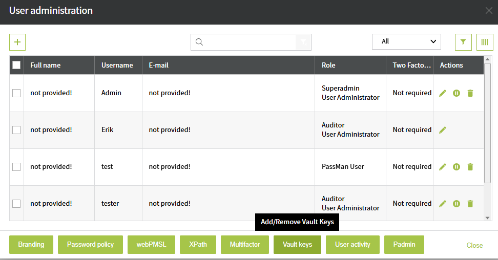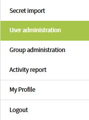 To manage (add/remove) Vault keys hover with the mouse pointer above the user menu located on the top right corner of the Home Screen which will trigger a drop-down menu. Click on user administration.