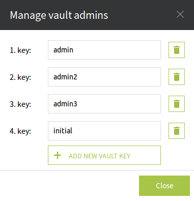 The base settings phase (More details in the Install page) the initial Vault key is autogenerated or for the cloud users the autogenerated vault Vault key included in the registration e-mail.