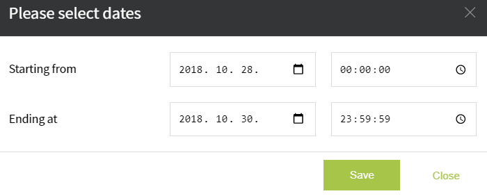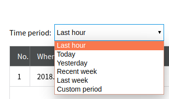 To see a specific time period, click on the drop-down on the top left hand side and select a period from the list: Last hour, Today, Yesterday, Recent week, Last week, Custom period. At the Custom period option, the user has to specify the starting and finishing moment in time.