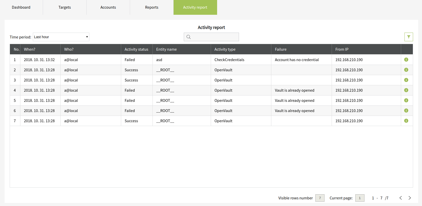 Activity report tab is the place where an Auditor (for users to see this tab they need to have Auditor privileges) can examine all jobs run by a user or run automaticly by the system (auto-check, auto-reset, etc).