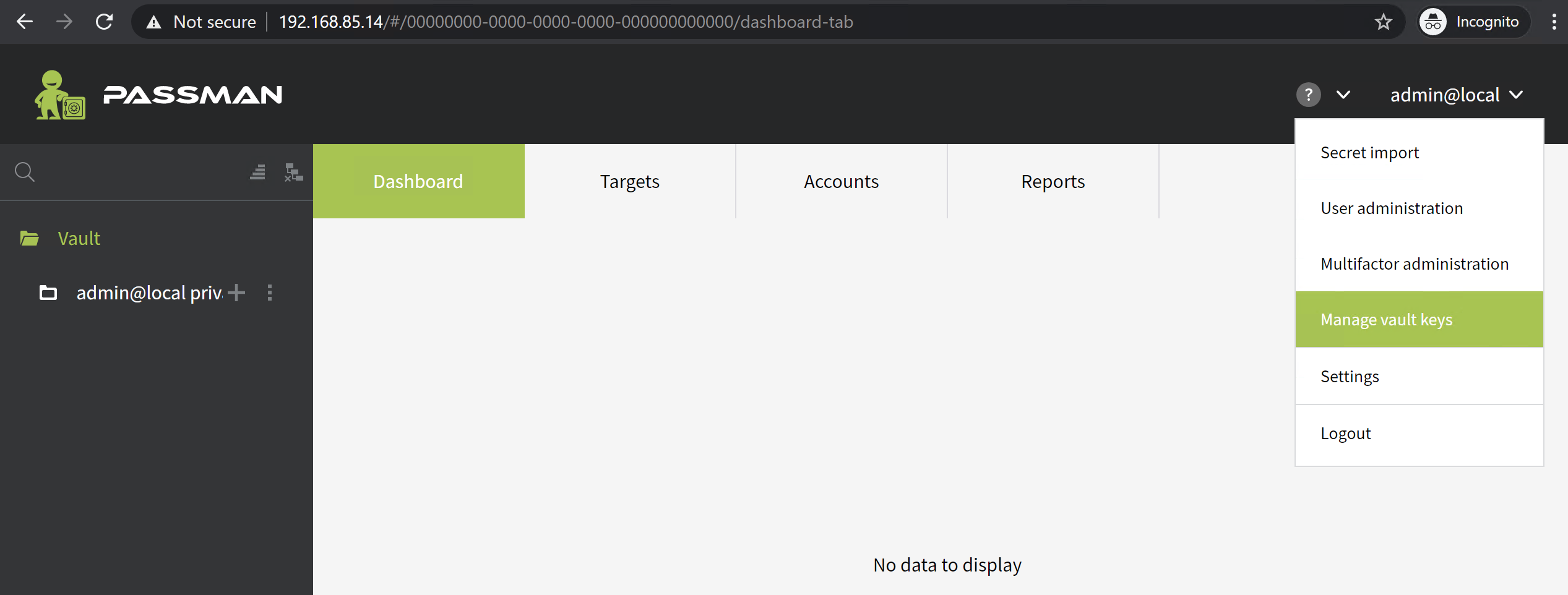 Ezzel az alaprendszer installáció, alapkonfiguráció befejeződött. Most már használható a PassMan, kezdődhet a titkok rögzítése.Jelszavakat importálásához vegyünk fel egy új felhasználót, adjunk neki a Széf struktúrán teljes jogosultságot, mert a kezdeti (szuperadmin) felhasználó nem importálhat.