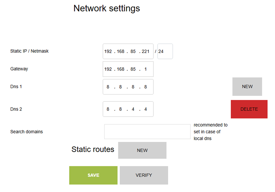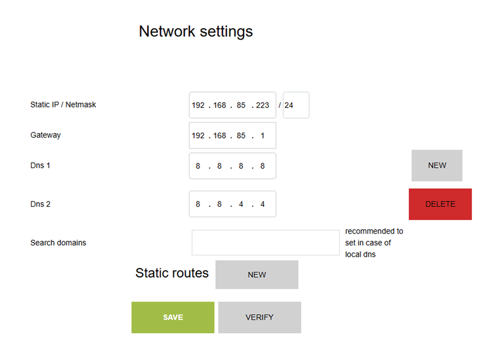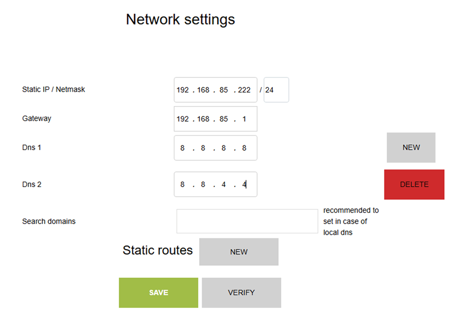 Menjünk ide: Hálózati beállítások. Itt meg kell adnunk a számítógép saját, statikus IP címét; majd a Gateway-t és a DNS-t. VERIFY, majd SAVE.
