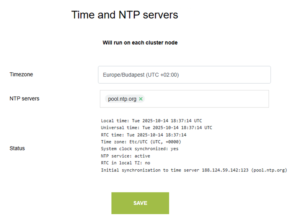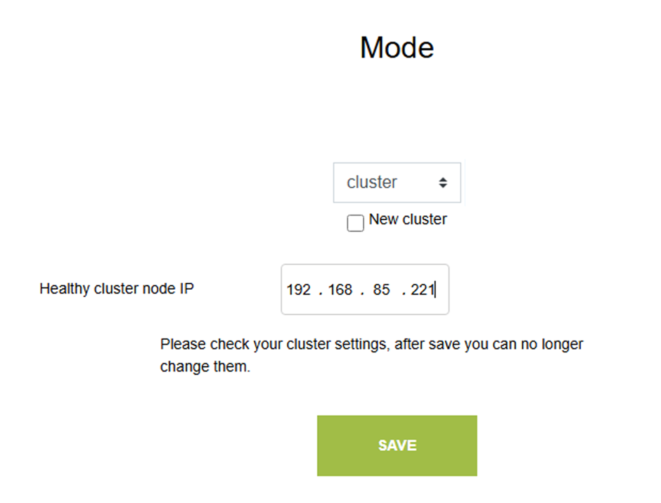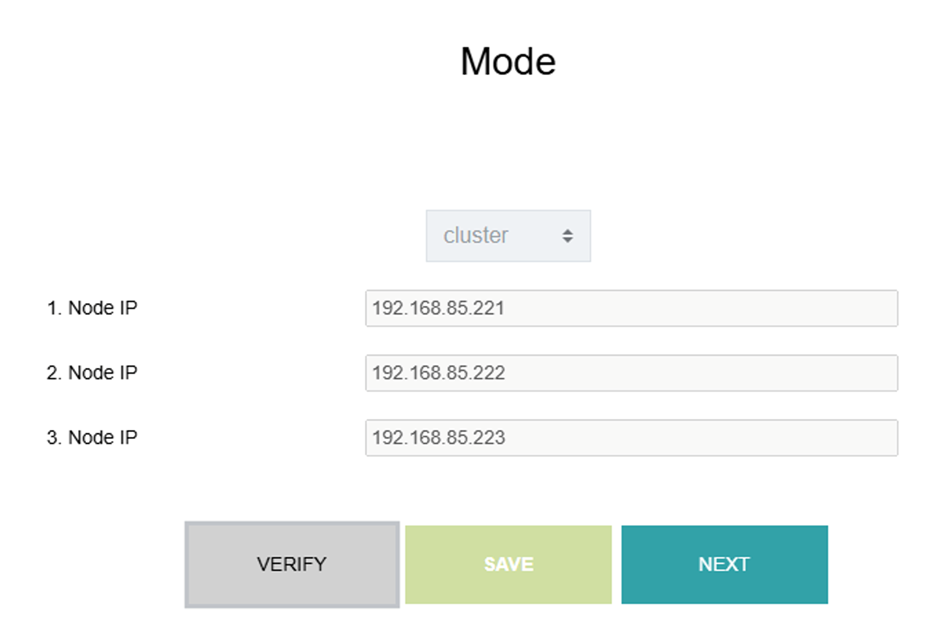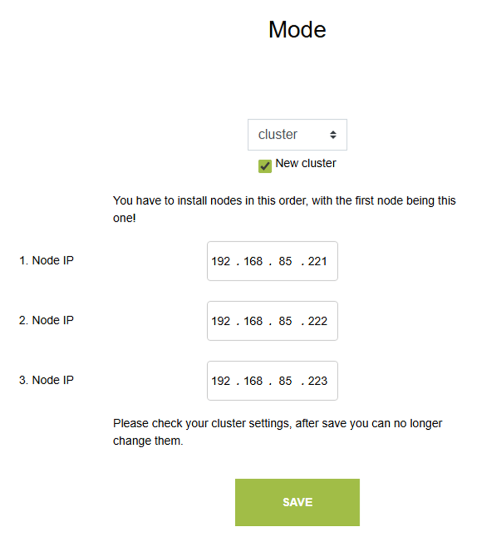 A Node IP mezőkben másoljuk bele a klaszter tagok IP címeit. Legelső helyre a mostani node IP-je kerüljön!
