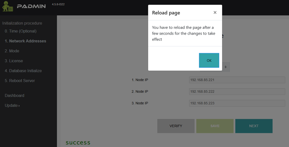 - Lépjünk be a Padmin-ba. Az első cluster-tag IP címét nyissuk meg először a böngészőben, https:// előtaggal együtt (esetünkben https://192.168.85.11/padmin).