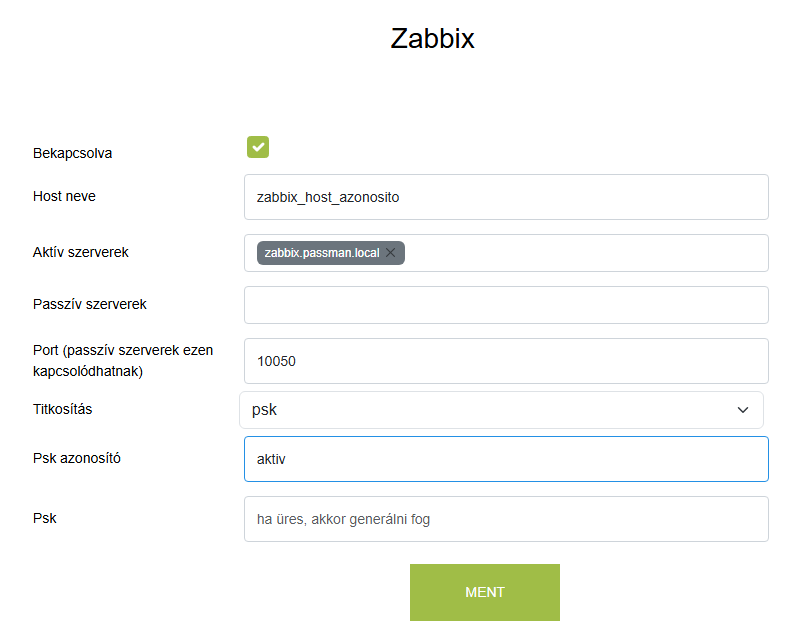 Host neve: Ez a Zabbix hostname-ben beállított egyedi azonosító, amit ide fel kell venni (Passmanban és a Zabbixban ennek azonosnak kell lennie!)