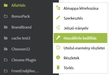 Ahhoz, hogy módosítani tudjuk a jogosultságokat a kívánt elem, aktiválnunk kell a környezetérzékeny menüt (... menüpont vagy jobb egérgomb), majd a listából ki kell választani a Hozzáférés beállítás menüpontot.