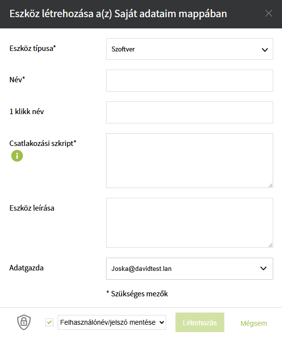 Az eszköz létrehozását követően a Felhasználói fiók beállítása következik, ahol megadhatjuk: