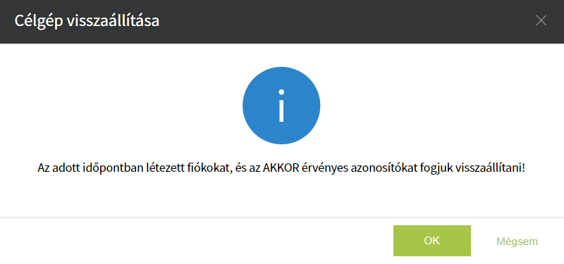 - Kattintsunk az ablak bal alsó sarkában található Célgép visszaállítása gombra, és fogadjuk el a figyelmeztetést, hogy a később megadandó időpontban meglévő fiókadatokat akarjuk majd visszaállítani